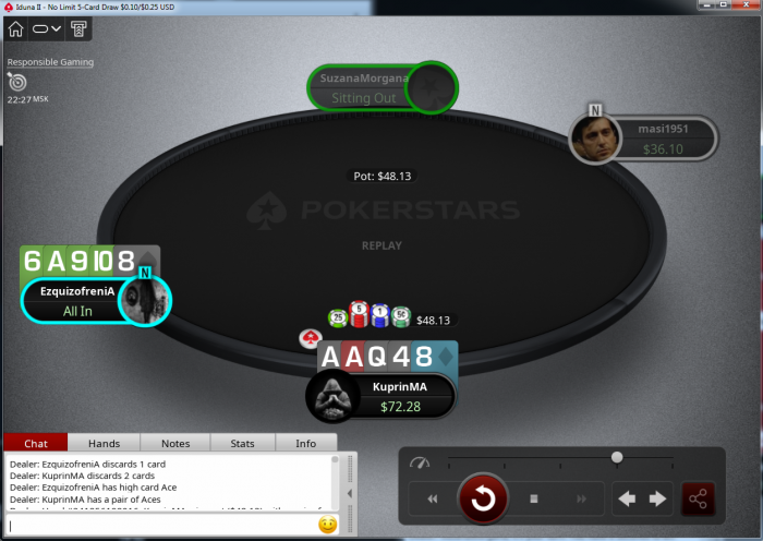 Всем привет! Продам доли на хороший выгодный для всех фриз с оверлеем, который нельзя пропускать!) Играю 10 лет. Сейчас чувствую особенный подъем и понимание в игре. Два дня назад с первого раза отобрался с 2$ в Sunday Million и 4 часа был большим чипаком в самом СМ, чувствовал хороший перевес, но два диких кулера и гг. (фулл в каре с флопа и АА в AQo ) Играю во все разновидности покера в плюс, не только в холдем, поэтому что-то понимаю. На ГГ играю редко, но такое событие пропускать было бы преступлением. Ник на ГГ "KuprinMA1". Играю дешево, т.к. ПОСТОЯННО вывожу бОльшую часть того, что выигрываю. Последние 2 года большинство сессий заканчиваю в плюс.