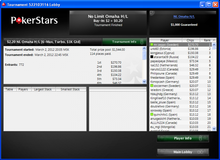Poker Stars $10+$1 No Limit Omaha Hi Tournament - t50/t100 Blinds + t10 - 6 players - View hand 1663981