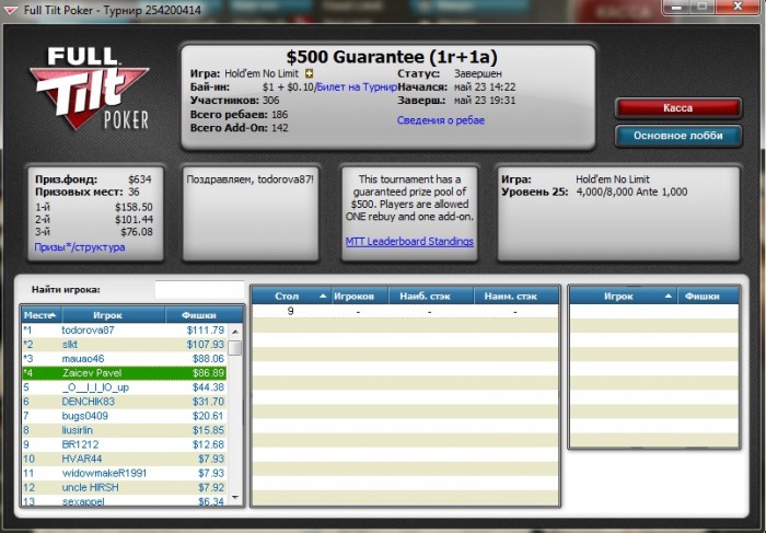 • Вечер вчерашнего дня принес только головную боль. Вот турниры, которые я сыграл: