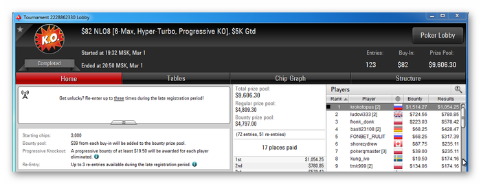 Ещё немного про оффлайн и Сочи. Понравилось казино, большое и красивое. Понравилась организация серии, всё чётко, наглядно, понятно и оперативно. Не понравились свободно матерящиеся за столом, не знаю какие действуют правила, никто не делал им замечаний, но иногда было желание дать по морде. Несколько дискомфортно когда все за столом знакомы друг с другом и с диллером тысячу лет, трындят о чём-то своём, такое ощущение, что попал на домашнюю катку, но это видимо нормально для оффа, такое будет иногда происходить, атмосфера живого общения и всё такое. Но когда у диллера спрашивают с кем она живёт и после ответа, что с подругой, предлагают соорудить бутерброд (это не вСочи было), соревнование превращается в клоунаду. На шестом-седьмом часу турнира резко падает концентрация и начинаю плыть в самый ответственный момент, когда и оппы посильнее остались и деньги начинают разыгрываться, тут наверное только наигрыш поможет, ну или разминка какая-нибудь, может выпить или съесть надо что-нибудь бодрящее.