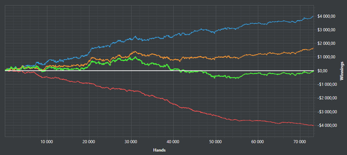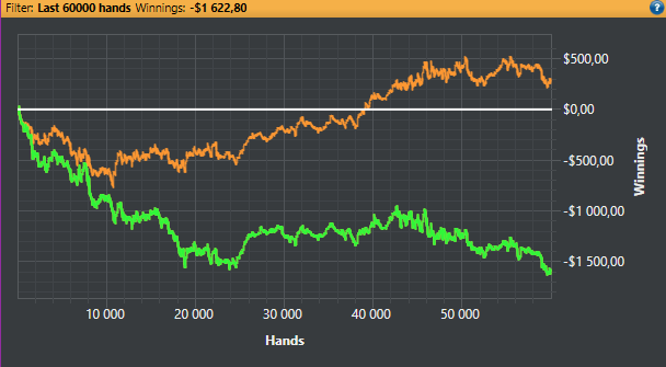Результатами, опять же, разочарован. Почти 150к рук на полтосе в +2,5 евбб/100, учитывая мой жёсткий селект, это провал. Либо у меня какой-то затянувшийся стрик (ага), либо я просто дно.