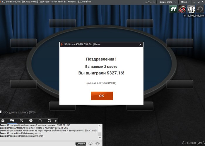 • Это не передать эмоциями, занял второе место в КО турнире. Баин 2.20$, после плохого рана в кэше захотелось МТТ покатать. Сидел с маленьким стеком 7/7 на финальном столе, играл как последний шпион, тупо все фолдил, даже выгодные моменты для стила с поздних я не использовал, просто ждал, когда другие повылетают, так как пей джамп идет по 40$. Когда осталось 4 парня, у меня был стэк 10бб, чипак 100+, второй 80, и у третьего около 70. Я ничего не открывал, смотрел как они глину месят) Как пришли премиум руки ТТ+, я пушил, меня закрывали, потому что за мою голову дали бы неплохой кнок. В итоге нереально обрадовался когда вылетел парень со стэком 70бб, так как мне за это насыпали уже 198$, а четвертое место было бы 130$.
