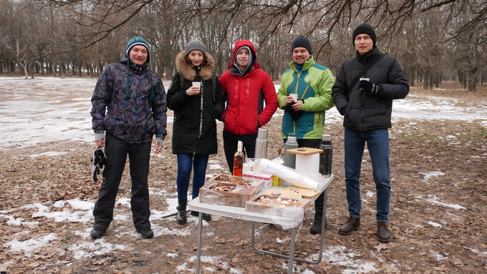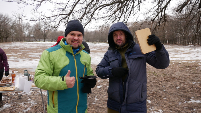 1. Ранним покерным утром (в 13:00) для активных и спортивных были организованы командные квесты по полуспортивному ориентированию на свежем воздухе (в парке Дружбы). Было потрачено много сил и эмоций , поэтому организованный там же импровизированный обед в стиле Карлссона (чай, плюшки , печеньки, колбаски на костре и прочие вкусняшки) был принят участниками на УРА! На свежем воздухе, да под лёгкий морозец, да под согревающие напитки, да побегав пару часиков по парку - все всё с удовольствием смолотили.
