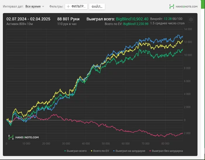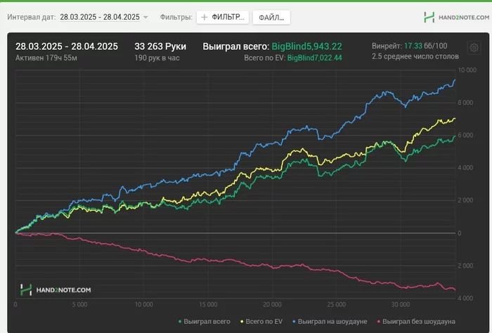 Выдался результат успешный, складывалось хорошо: составы были отличные, блефы удавались, раздавали хорошо. По деньгам вышло ~ 2250$.