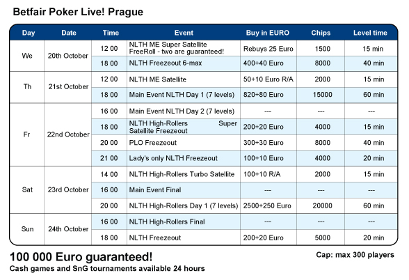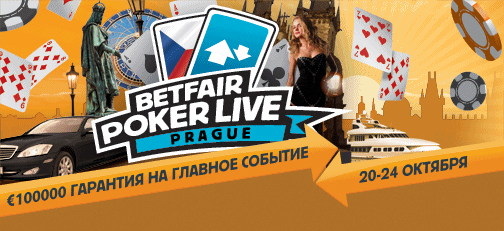 Вы можете квалифицироваться на главное событие Betfair Poker Live! Прага через онлайн сателлиты (https://site.poker.betfair.com/ru/promotions/betfair_poker_live_prague.html) и выиграть пакет стоимостью $1,850!