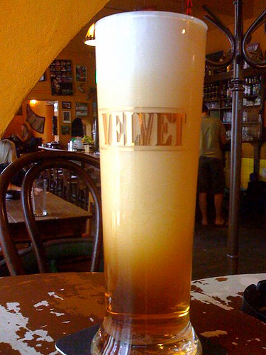 Отдельно хотелось бы рассказать о необычном пиве Велвет (Velvet) - очень густом сорте темного пива со слегка горьковатым, бархатным вкусом. Разливается это пиво в бокал вместимостью в 400 мл по так называемой технологии ирландского типа, при разлитии пива использующая смесь азота и углекислого газа в пропорции 1:1 для выдавливания пива из бочки. Это дает лавинный эффект, он же "буря в стакане", густая белая пена заполняет весь стакан, при этом на дне бокала появляется черная жидкость, которая "поглощает" пену, но не всю, сверху она остается. "Велвет" обладает густой, долго держащейся пеной, а вкус у этого пива слегка горьковатый, пряничный.