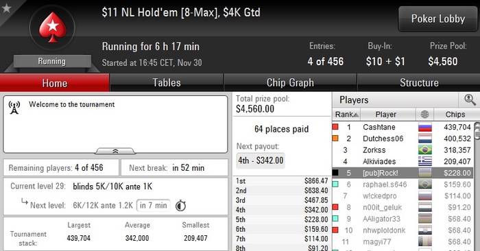 Poker Stars, $10 Buy-in (25/50 blinds, 5 ante) No Limit Hold'em Tournament, 9 Players