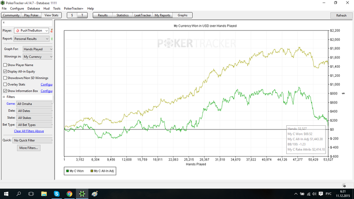 Hero (CO): 121 BBBTN: 445.6 BB (VPIP: 93.13, PFR: 68.13, 3Bet Preflop: 50.00, Hands: 161)