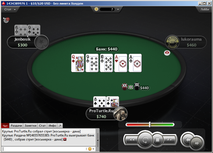 Была удивлена "везением" которое меня сопровождало в течении примерно 20 раздач, пока я не заняла 1 место и не выиграла турнир. Просто я много читаю ... у слышала о том, что часто для привлечения и удержания недобросовестные румы для начала делают так, что UCX (по-моему так называется механизм) выдавал более "интересные" комбинации.