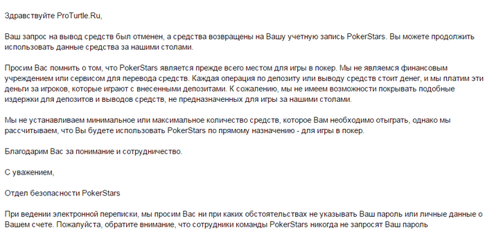 Написала им письмо: Тогда я прошу Вас, написать мне минимальный размер средств, которые я смогу вывести в ближайшее время, для того что бы убедиться что это вообще возможно сделать. Вы понимаете, что я впервые играю на реальные деньги и специально выбрала "самый большой и надежный" покер рум и сейчас у меня вообще появились сомнения, что мне не только мои деньги вернут, не говоря уже про выигрыши.