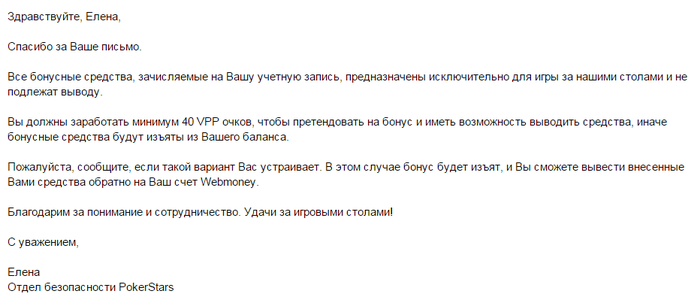 Написали они мне письмо, скриншот дальше. Если бы я знала, что такие заморочки будут с бонусом, НА КОТОРЫЙ САМИ ОНИ МЕНЯ И УГОВАРИВАЛИ, то не делала бы его. Тем более сказала же, что играть буду 100 турниров по 0.1 долларов и тут не бонусы, ничего не нужны. Желание было в случае успешной катки пополнить счет на 1000 долларов и играть по 1-2 доллару, но теперь желание пропала и занялась поиском других румов. Если кто-что подскажет, буду очень признательна.
