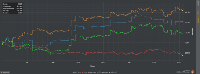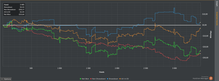 Start Bankroll 643,62$; Stop Banrkoll 619,97$; Cтолов 6; Мини сессий 6; Рук: 3446; Время = 360 мин; Результат = -23,64$; bb/100 = -13,72; Моя оценка = 0 з 10. Цель на день Net Won(45$) выполнена на -52,5%; Цель на день Hands (3200) выполнена на 107,6% Цель Руки на первый игровой отрезок за все дни (100К) выполнена на 78,1% (78182 рук); Цель Win Rate на первый игровой отрезок за все дни (542,74$) выполнена на 30,1% (163,77$); Comment: Даун немного и Я поплыл...