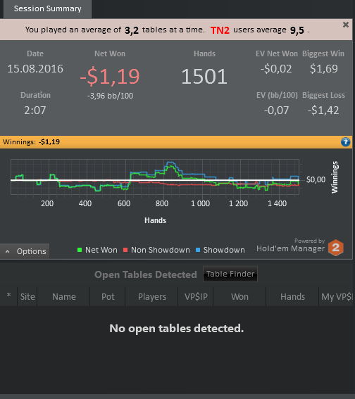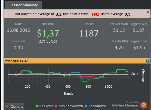 Отыграл 1,5к рук (-1,2$) EV:-0,02$