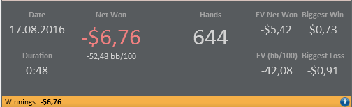 Не садило за зум столы с баином меньше 2$ , решыл покатать рег столы , результат жудко плохой -6,76$ EV: -5,42$ (650 hands)