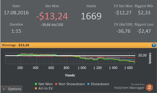 -13,24$ EV: -12,2$ (1,6k hands) После 3й сессии которая была в + по ЕВ похоже начался тильт или же это не понимание игры, пока не пойму.