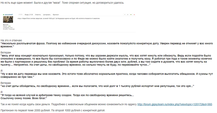 коллега, модератор, не зависимо от вашего отношения ко мне, я спокойно могу отдать ему эту тысячу через месяц или два, сославшись на болезнь или любые другие причины и буду прав. Поэтому старайтесь быть обьективным, потому как мой оппонент явно не совсем и полностью передо мной прав.