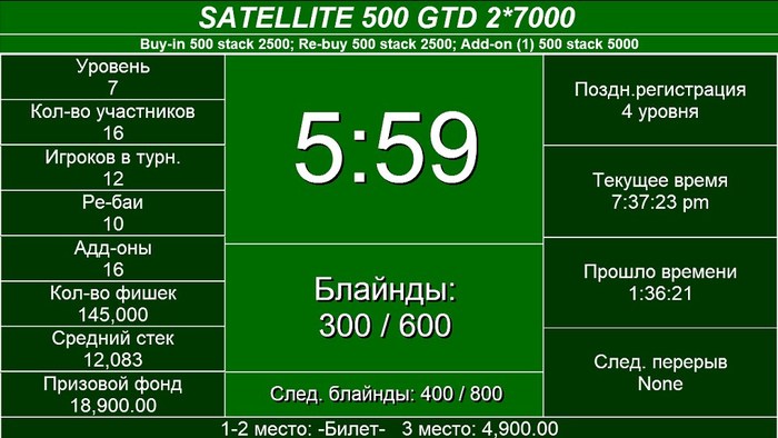 Застраховали баббл на 7000 5 место 12000 - Жидков Артем 4 место 16500 - Ахмедов Ахмед 3 место 24500 - Улубеков Мурат Оставшись вдвоем поделили по 45000 Козлов Андрей и Голото Дмитрий, а оставшиеся 10000 решили разыграть. Победил Дмитрий. Наши поздравления победителям!!!