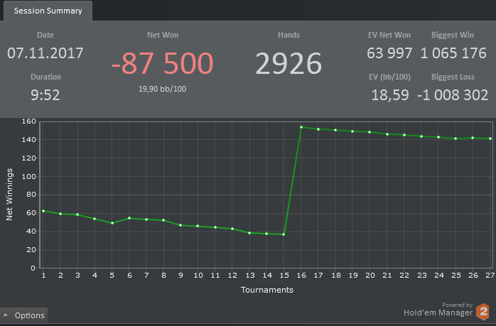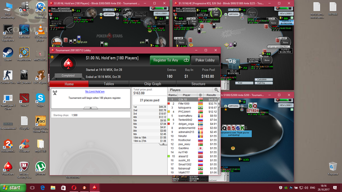 Сегодня откатал 27 мтт , результатом не очень сильно доволен так как в начале было очень много грязи что повлияло на результат, а в целом довлен своей игрой, скил растет, банкрол вроде тоже укрепляеться =) Банкролл если добьем до 900$ ,буду пробовать шотиться на снг 36-180 макс по 4.5$