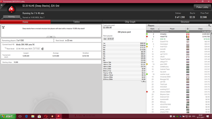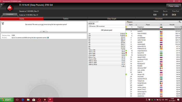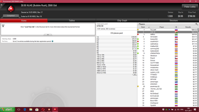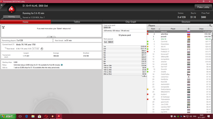 сейчас катаю СНГ 180, 45 макс и кноки за 1.5 на 90 тел + mtt reg speed za 1.10$ За год особо ничего не поменялось , начал заниматься боксом, ну и прибавил немного в игре в покер, после долгого перерыва снова начинать трудновато с нынешними реалиями, но постораемся вырваться из грязи в князи Особых заносов за эти три недели не было, зато втащил 3 по 50 $ снг 180 макс, скрины как бы не делал только один для шапки В МТТ было пару предфиналок и одно 9 место в мелком турике все как всегда по грязи !!!! Короче поехали, я вам так скажу )