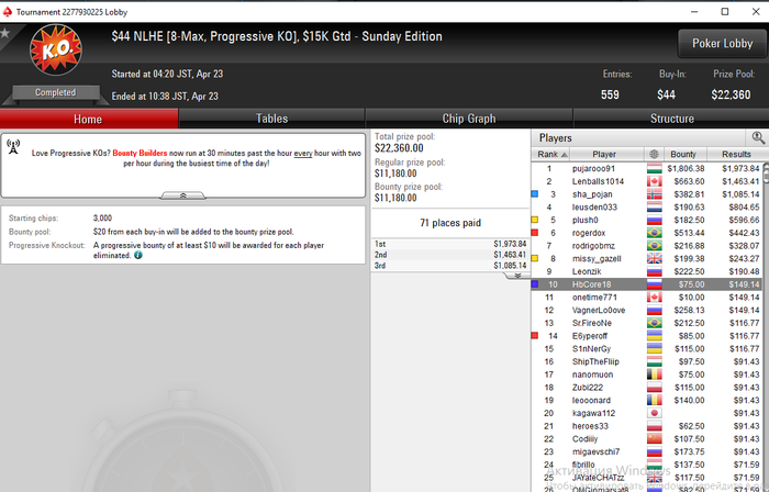 chikan0k1990, да и не такое бывает. Все искал видео где чувак в тотал КО (100% КО) в килополе дошел до топ18 и заработал 0$ что то в этом роде. Вот это удивительно :) Может кто знает как это видео найти?