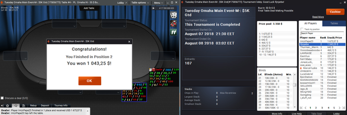 а хуй его знает Сегодня по плану не должно было быть игры, а больше работы сезонной, в ней пока тоже насыпает не хило, даже не знаю как разорваться)) Но решил эту проблему тем что погулял с детьми, а жена успела поработать, а потом я сел катать. Пока прет надо катать и Сегодня как обычно взял трех баблов по омахе хай-лоу, примерно на 150 долл имея не плохие стеки. Через пару часов будем тренироваться-вернее учиться, вернее мне скажут что я олень в мягкой форме, но возможно это будет поворотом в этой игре, так как уже прям тупо лечу вниз и иногда исполняю такую несусветную ХУЙНЮ, что при анализе вообще не понимаю кто был на моем месте, где были мозги и есть ли они и зачем они нужны? Вроде сейчас не катаю старзы и игры мне хватает с головой, при чем я даже не всегда могу грузить хотя бы один стол холдема. Может позже рискну еще раз добавить Кинг, там скоро кстати серия начинается, омаха будет тоже+ стад бывает. В омахе хай все как-то хорошо, правда сегодня я не сумел нажать фолд против не плохо рега, у него конечно есть сеты девяток разве (ну возможно 10, но хз, А9хх), врапчики могут быть, но я не сумел скинуть две топ пары, думаю, что спорная раздача, в принципе монеточка вышла.