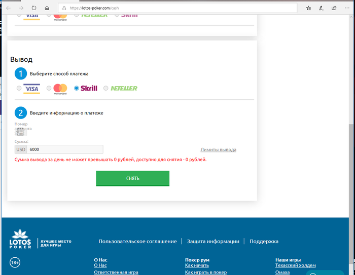 Депаю скриллом, а вывода скриллом больше нет. Вот так новости.) Хотел обмазаться грязью и сыграть местный зум. Кнопка ситуата на след. бб отказалась работать, второй стол вообще заглючил и открылся в html формате) Долго на мастеркард usd идет вывод? Как раз пополнить карту нужно одну)