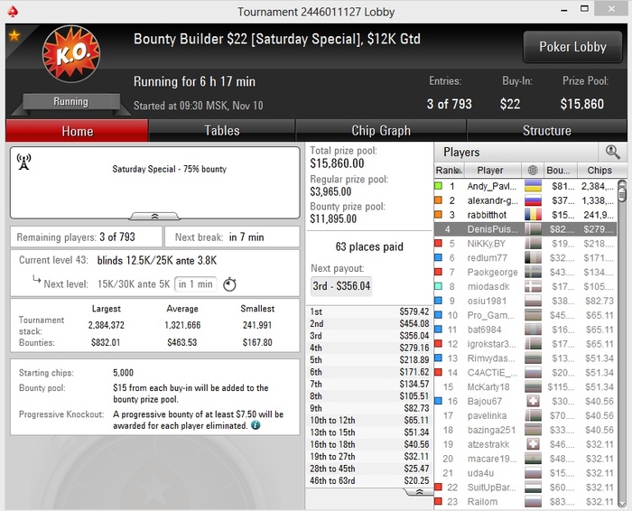 Всем доброго времени суток! Давненько не заходил сюда, последнее время не катал, начал только с субботы, занимаюсь здоровьем, сейчас ещё как ни кстати начались проблемы с болью в пояснице, несколько дней с боков только болело, сейчас же полностью вся, был у доктора навыписывал таблеток и от спины и от почек, лол конечно. С вчерашнего перешёл на вечер (упор на 180мах по баксу и 90мах по 1.5), не удивляйтесь, сейчас это будет только на пользу + МТТ до 11уе включительно. Дипов как таковых и не было, вчера ТОП20 турбинки по 2.2 дали мелочи, сегодня ТОП5 2.2 Слэма синего с ТП против фд за годный стек в одной из первых раздач на финалке поехал и не сложилось( Ещё ТОП35 БИЛДЕРА 7.5 сегодня, и в целом всё пока что! Правда так не привычно катать эти килополя, но да ладно!