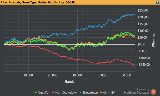 Всем привет, я топ рег нл2 с винрейтом ~16бб\100 за ~50к рук(пруфов не будет, база удалена), теперь покоряю нл5, играю на 888, пока идёт не очень, буду выкладывать промежуточные результаты. Никами не делюсь, я люблю анонимность Текущий винрейт 2,5 бб\100 Актуальный график 888 нл5 (обновлено 21.04.2019)