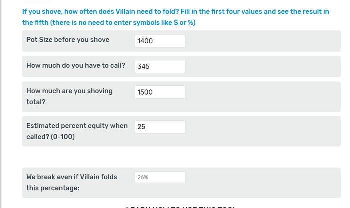 ЕВ пуша = Вероятность что оппонент сфолдит * (Размер банка, который мы заберем в случае фолда) + (1 - Вероятность что оппонент сфолдит) * (Наше ЕВ * размер банка, который выигрываем - (1 - Наше ЕВ) * Размер банка, который проигрываем )