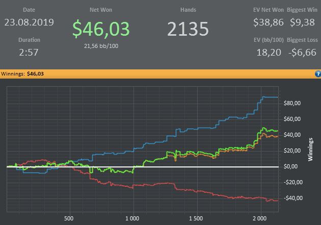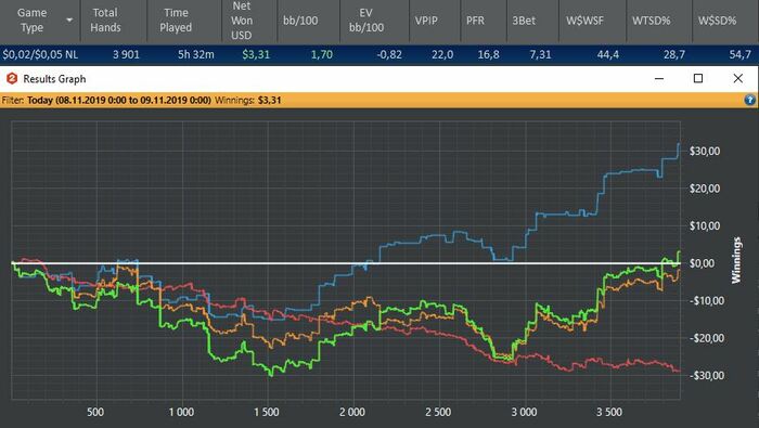Даже график выкладывать не буду. Сыграл около 600 рук на нл10, плюсанул 15 баксов. Утром ходил по делам, а сейчас с друзьями увидеться надо.
