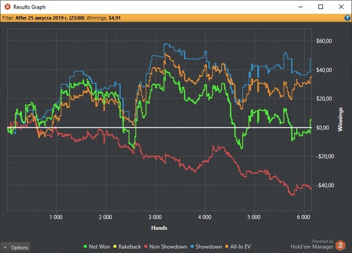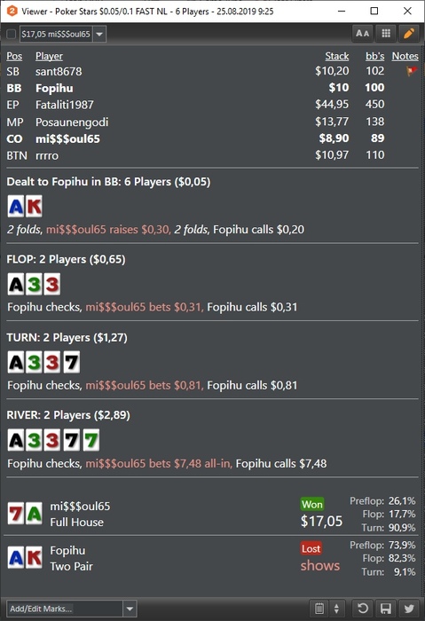 25.08.19 Сложный выдался день. Считаю успехом то, что даже на пике проигрыша не впал в тильт/автоматизм. Мог закончить +2 БИ как минимум, но в голове, видимо, еще слишком пусто, чтобы не делать подобные колы: