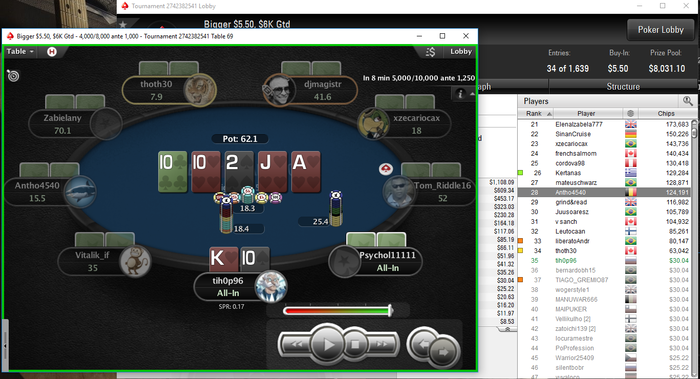 Прям сейчас закончил катку в Биггере за 5.5 баксов. Обычная ситуация с сб на бб, флоп порадовал, все улицы оппонент донкал полбанка, на ривере чек. Вэлью пуш от меня, т.к имел блокеры на стрит Король и на натсфлеш тот же Король, ну и эта ситуация с сб на бб все таки. К сожалению парню неплохо повезло, оказался KQ на сб и доехал стрит, а так был бы неплохой стак у меня, думаю на финалку были бы неплохие шансы, но увы и ах.