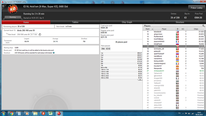 Еще по мимо кэш столов,играл пару турниров накаут по 3$ Так вот в одном вылетел,а вот в другом хоть дотянул до призов. Эхх,а думал займу первое место Пойду попью пивка и посмотрю фильм,Всем удачи ребята за столами,ловите рыбок