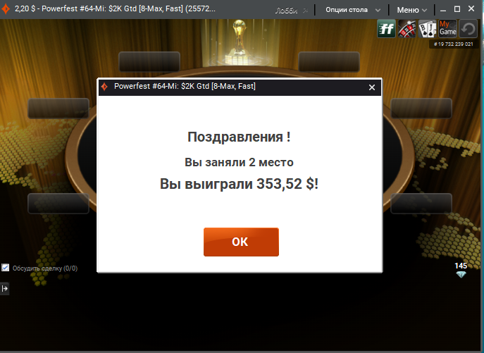 . Второе место в Powerfest64М где вышел в хед-зап но переиграть оппа не удалось записал в свой актив 2 место и 354 $