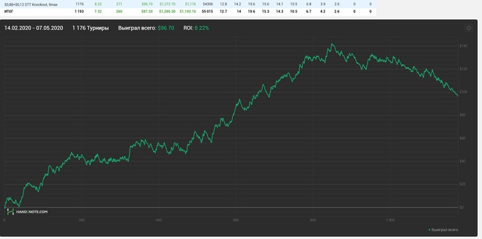 На данный момент БР 100$(пришлось делать кешауты). Пока буду играть 1.5$ KO 90 MAX, планирую набить 500$ и начать подгружать мтт от 3.3$(до 3$ не вижу смысла играть). Первая цель - набить БР для игры в мтт на аби 3-5$.