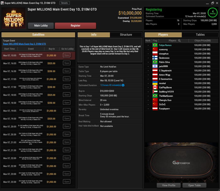 + сейчас заходишь в любой сателлит в который идет регистрация, и показывает что это сателлит к турниру который будет идти через час, но по факту регистрирует на завтрашний