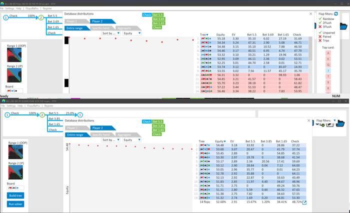 радугой, один из самых доминируемых флопов для коллера, агрессор преимущественно играет через овербеты, обычных сайзов вообще нету, эту страту переняли и многие топы на высоких лимитов, при этом коллер должен оверфолдить около 70% и играть почти без чек-рейзов данную структуру, даже не смотря на то что тут еще и отсутствует флеш-дро, все равно солвер все равно предпочитает овербеты