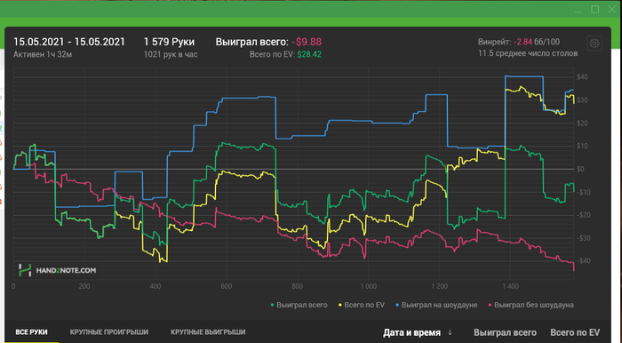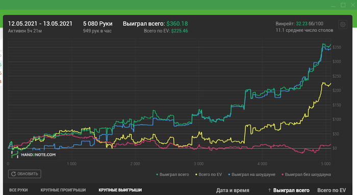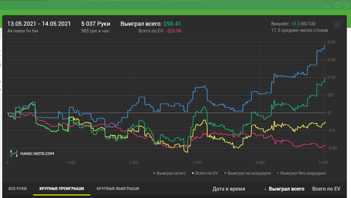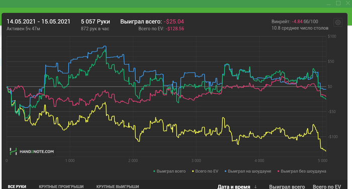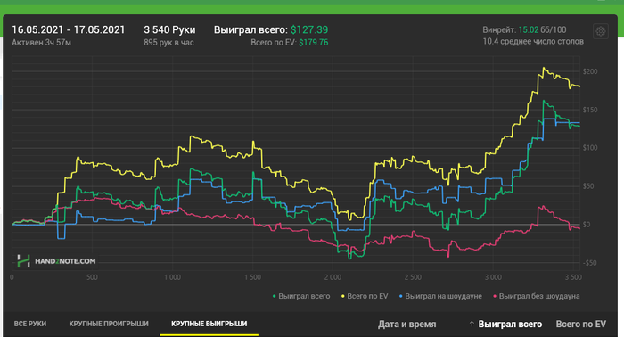 Всем привет!) Сегодня не выкатал необходимые 5к, игра около 4 утра развалилась совсем. А рубаться на 5-6 не полных столах с регами даже при наличии пары фишей для меня скучно) Откатал 3,5к. Сейчас сыграно 30к рук(в запасе была сессия 1,5к которую отыграл пару дней назад). Так что идем по плану! Единственное что я заметил, начинать нужно раньше, около 22-00 что бы катка была на пике! В середине очень плохой ран был, все почти по красной слил, не заходило, а вот по конец насыпали чуток ситуаций, которыми я успешно воспользовался.