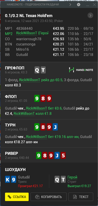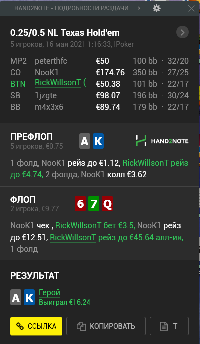 Опп взял 20 сек таймбанка и засунул. Нажимаем кол, - смотрим в блеф "Найс". Как я и говорил удобная ситуация для него, но все же такой хенд я бы на его месте не пушил.