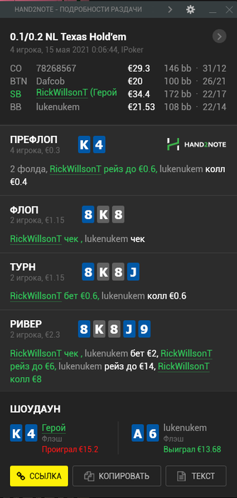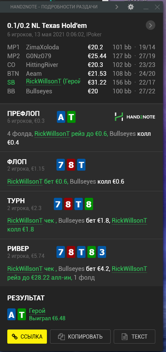 В следующей раздаче, решил превратить руку в блеф, так как блочу натсовый флеш и фулы типа Т8