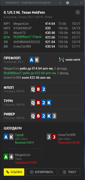 Ривер ничего не меняет. Опп пушит овербетом. Изображает по сути только флеш, причем натсовый типа A4, A2, AT, AJ, AQ(думаю мелкий бетнет около 2\3).