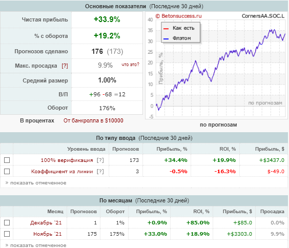 Вроде ничего не менял, думаю в корнерах просто дисперсия. Хоккей, возможно, широковато стал ставить. Сегодня разберу базу, посмотрю. Вероятно подсокращу немного количество прогнозов на ноябрь.