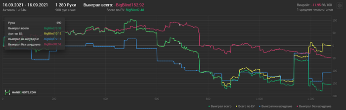 Дважды съездил с QQ в KK и один раз с KK в AA в поздних позах - две выиграл, одну сплитанули. Плюс закрыл комбодро в 3бет поте. Короче везде было не отскочить. Попробовал немного скорректировать стратегию, присмотревшись к тенденциям поля. Возможно где-то переагривал, но в целом терпимо.