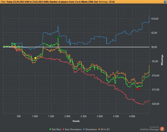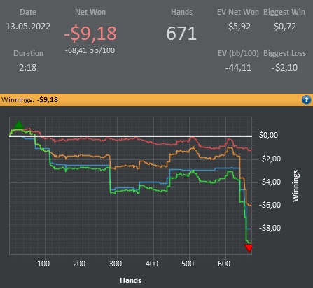 • Не мой сегодня день ) Как то не складывалось, плюс под все это, местами переигрывал свои новые трибеты )) Хорошо что последние 350 рук, отмазали почти половину, а то уже был бы страшный тильт )