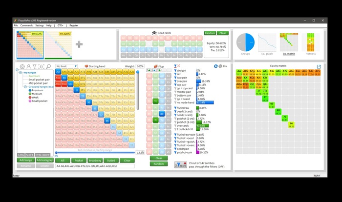 • Только что купил Flopzilla ) Кстати, стоит она 25$, но содрали еще налог в 5$ ) Не знаю зачем и что с ней делать, но где то там далеко далеко, чувствую что она мне нужна. Ну как не знаю, ну наверное, для понимая силы своих диапазонов, на определённых досках. Вот открываюсь я и понятия не имею, ставить или чекать. А я так понимаю, во флопзиле, можно в этом разобраться, но пока не знаю как. Вообще давно хотел ее купить и теперь она у меня есть. Осталось разобраться, как она работает и как в ней работать ))