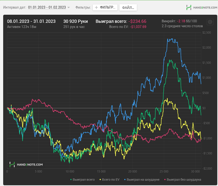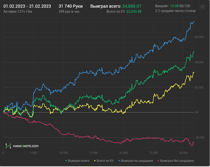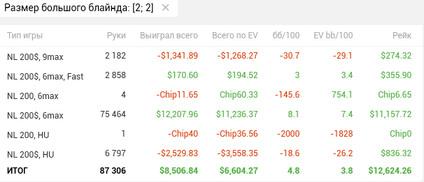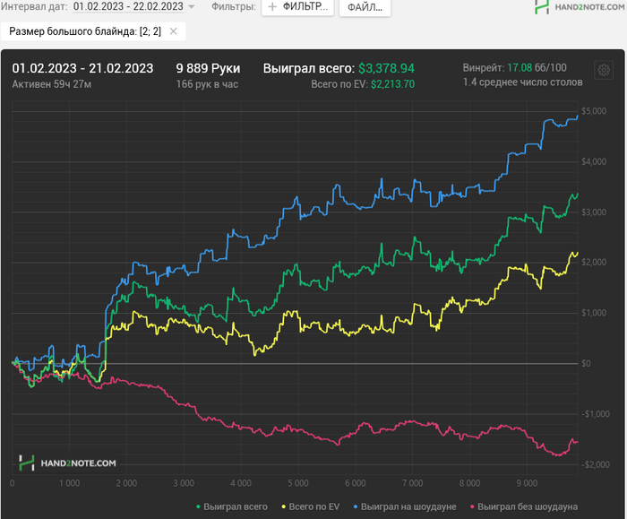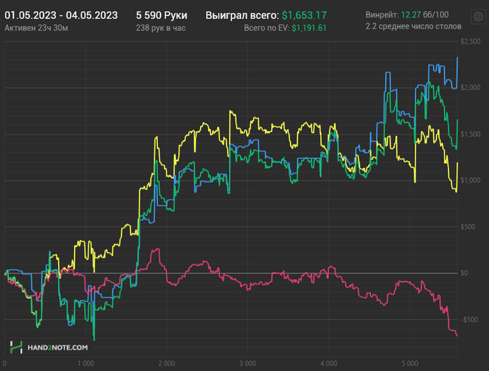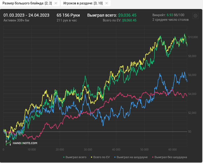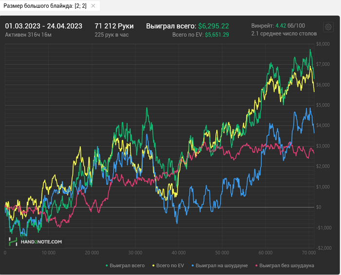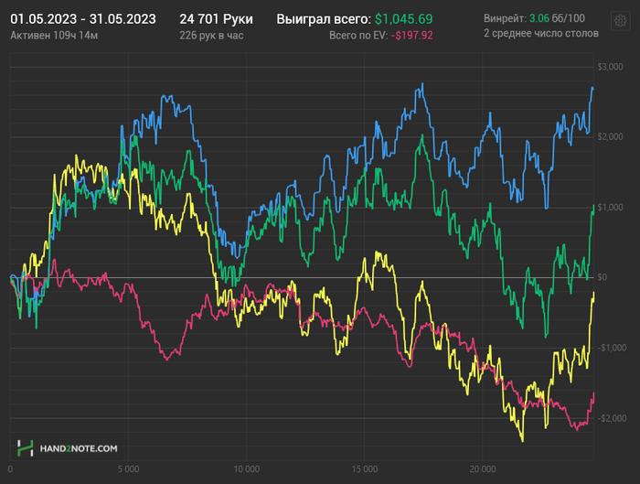 Был немного расстроен результатами марта (не столько в денежном эквиваленте, сколько по своим ощущениям), поэтому хочу поделиться результатами за 2 последних месяца сразу. Как писал ранее, NL100 был полностью отключен. Моей стратегией игры на NL200 была отработка по часам без просмотра промежуточных результатов до конца месяца. Такой формат мне полностью подошел, так как при открытии результатов и увиденных там 5 горящих красным цветом стеков - мое состояние становилось, мягко говоря, неоптимальным.
