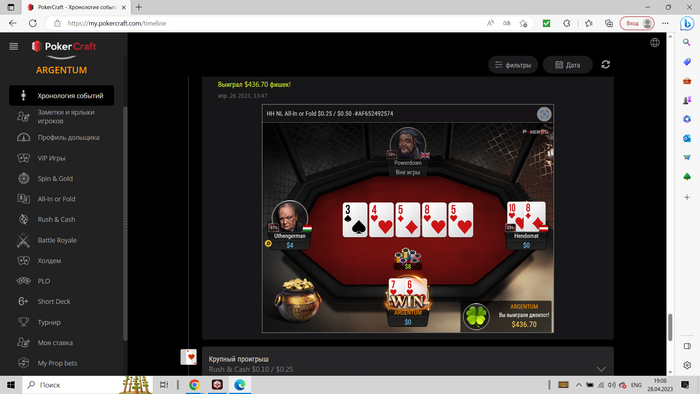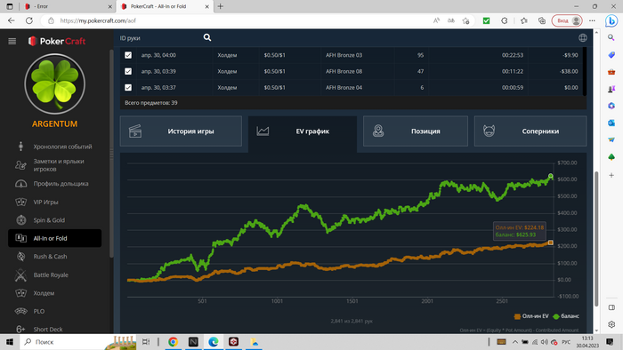 Еще играл немного Allin or fold и о чудо! выпал джек на 436 $ Я всерьез задумался сделать эту дисциплину для себя одной из основных.она возможно бьется за счет ну откровенно очень слабого поля(но это не точно)