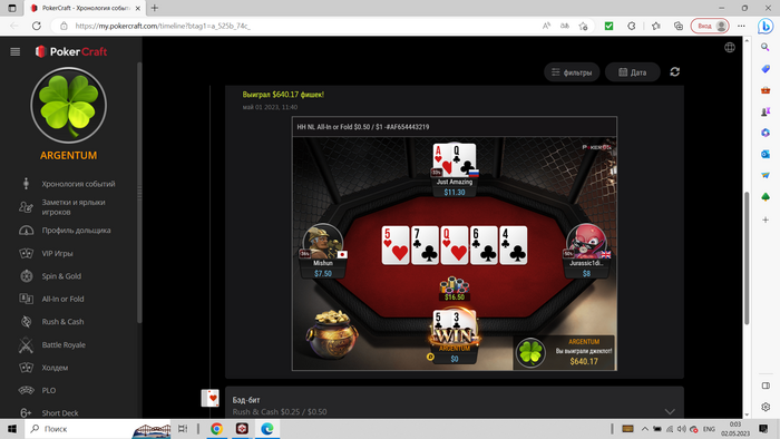 Доброй ночи!Ну что могу сказать праздничные выходные прошли очень продуктивно у меня😀Выпал мне еще один джек в ALLIN OR FOLD на 640 баксов