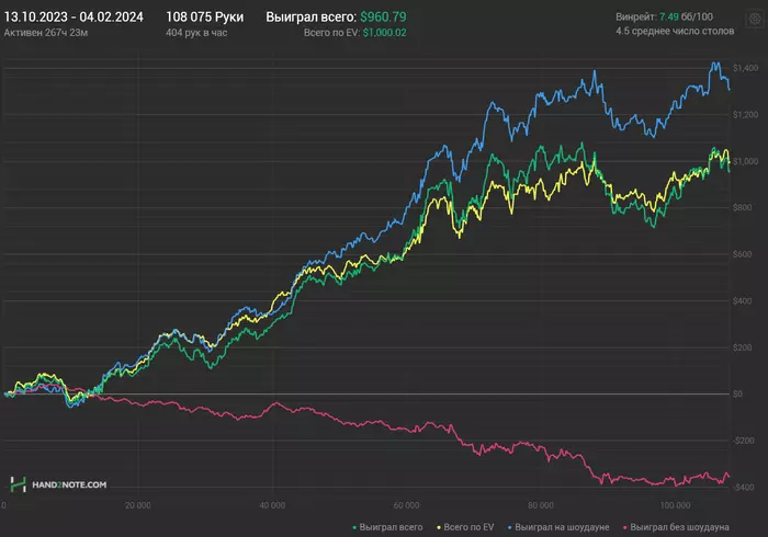 1) Игра - 110 часов, максимальная концентрация. Планы по кол-ву рук не ставлю, потому что буду играть максимально комфортное кол-во столов. В среднем это 5-6. Лимит нл25, возможно попробую сделать пару шотов на нл50.