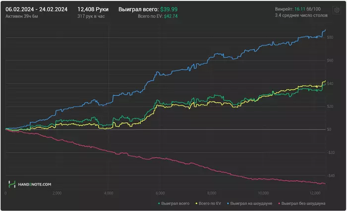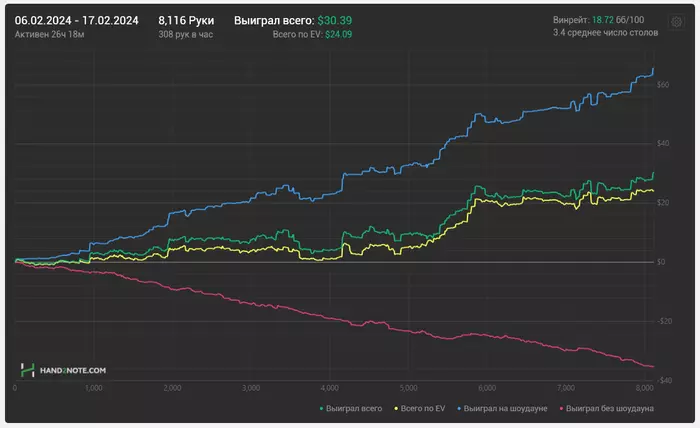 ББ/100 подрос, понимаю что из-за маленькой дистанции результаты не очень надежные, но я не вижу причин по которым они могли бы испортиться. Не сказал бы что меня апало всё время, были и переезды. Были так же и ошибки, играл бы я аккуратнее и думал головой несколько дней назад -- запросто могло бы быть 20-21бб/100. Стараюсь выбирать столы с короткими стеками, и играть на велью, пожалуй самый простой и надежный способ пройти нл2.